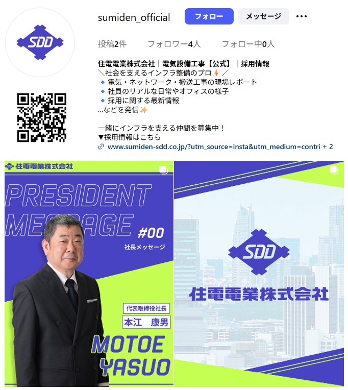 TOP>インフォメーション>Instagram公式アカウント開設のお知らせ インフォメーション Instagram公式アカウント開設のお知らせ 当社では、情報発信の充実と皆様とのコミュニケーション強化を目的として、Instagram公式アカウントを開設いたしました。Instagram公式アカウントでは、事業紹介、採用情報、教育の紹介など、従来にない新たな視点の当社の活動を発信致します。ぜひ当社のアカウントをご覧いただき、フォローしていただけますと幸いです。 住電電業株式会社 Instagram公式アカウントURL:https://www.instagram.com/sumiden_official/ 一覧に戻る